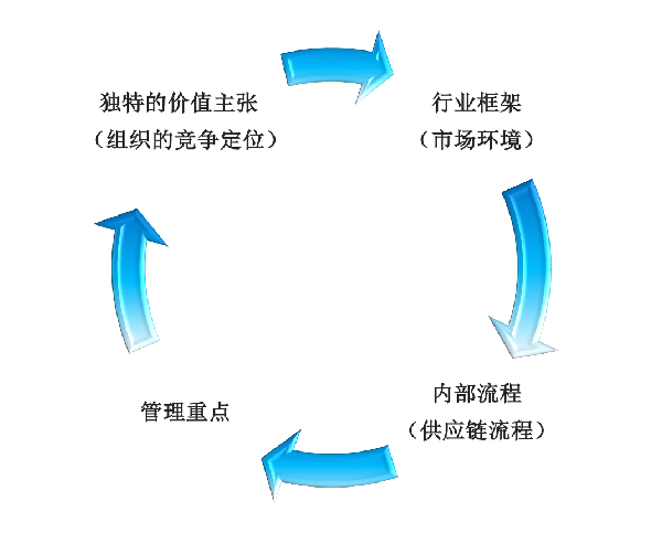 供應(yīng)鏈戰(zhàn)略是從企業(yè)戰(zhàn)略的高度來對(duì)供應(yīng)鏈進(jìn)行全局性規(guī)劃,它確定原材料的獲取和運(yùn)輸、產(chǎn)品的制造或服務(wù)的提供、產(chǎn)品配送和售后服務(wù)的方式與特點(diǎn)。一般情況下,組織的供應(yīng)鏈戰(zhàn)略是由四個(gè)要素之間的相互關(guān)系決定的,即行業(yè)框架(市場(chǎng)環(huán)境);獨(dú)特價(jià)值主張(組織的競(jìng)爭(zhēng)地位)、管理重點(diǎn)(供應(yīng)鏈流程與業(yè)務(wù)戰(zhàn)略之間的聯(lián)系)以及內(nèi)部流程(供應(yīng)鏈流程)。